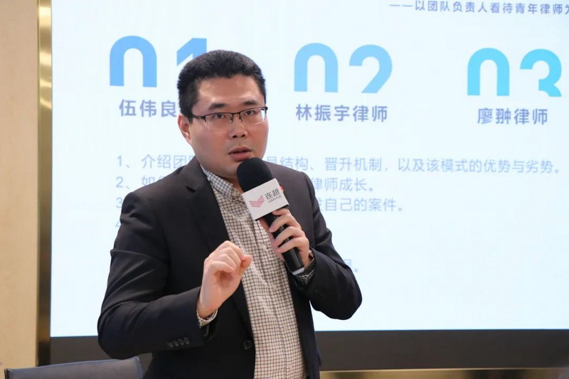 伍伟良律师首先介绍了团队模式、人员结构、晋升机制,以及该模式的优势与劣势,随后以团队负责人的身份与眼光围绕如何培养、帮助团队青年律师成长,新时代青年律师的优点、缺点以及特点,律师团队与青年律师的相互供需关系,团队建设的困惑以及团队负责人眼中不可原谅的错误等进行团队建设与调整展开了分享。